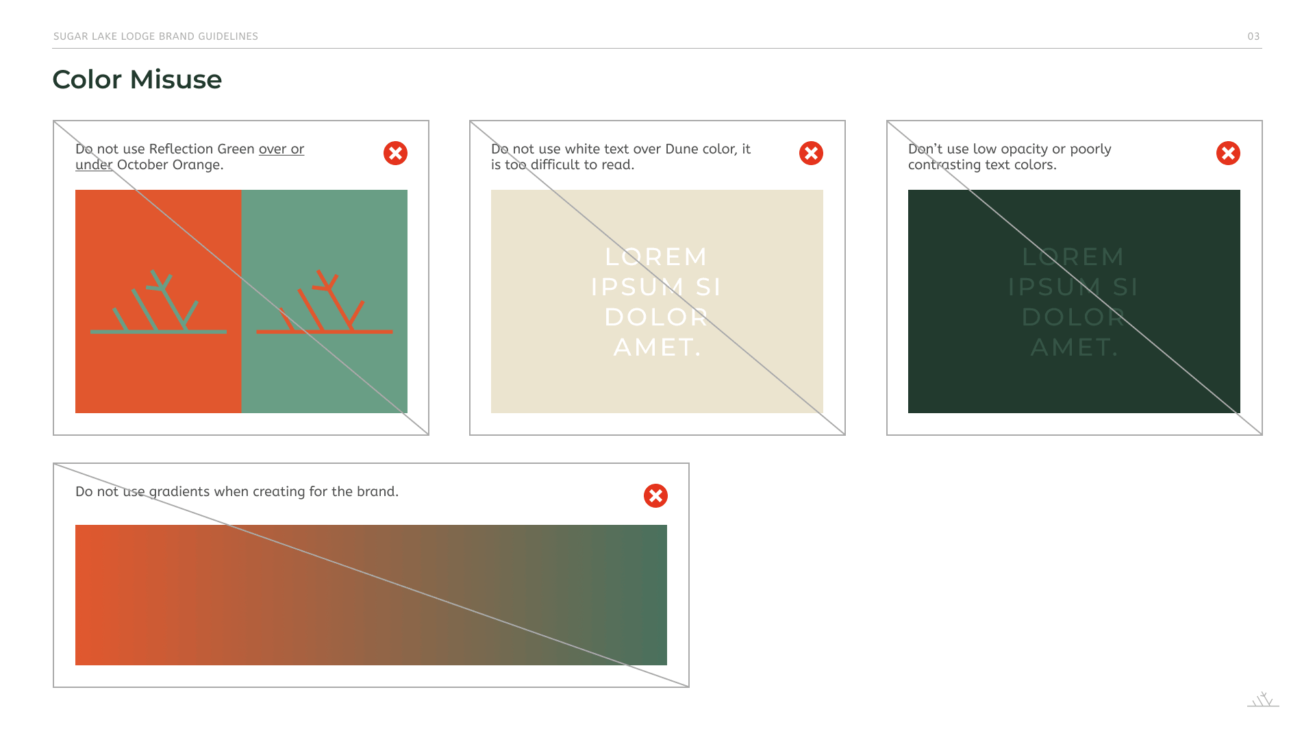 Sugar Lake Lodge’s previous branding was outdated and hadn’t been revised since their founding in 1994. The new branding needed to fit with a ‘northern aesthetic’ while also capturing the modern and family-focused vision for the lodge set forth by the new General Manager.