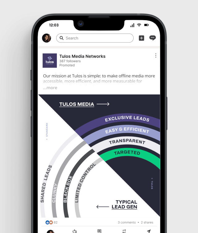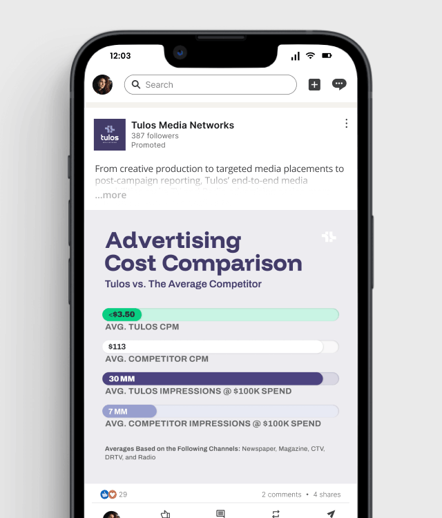 Tulos offers premium TV & radio media inventory at a fraction of the cost of competitors. The company's end-to-end media campaigns are built to drive performance for direct response advertisers, brand response advertisers, and traditional advertisers that need efficiently-priced media.